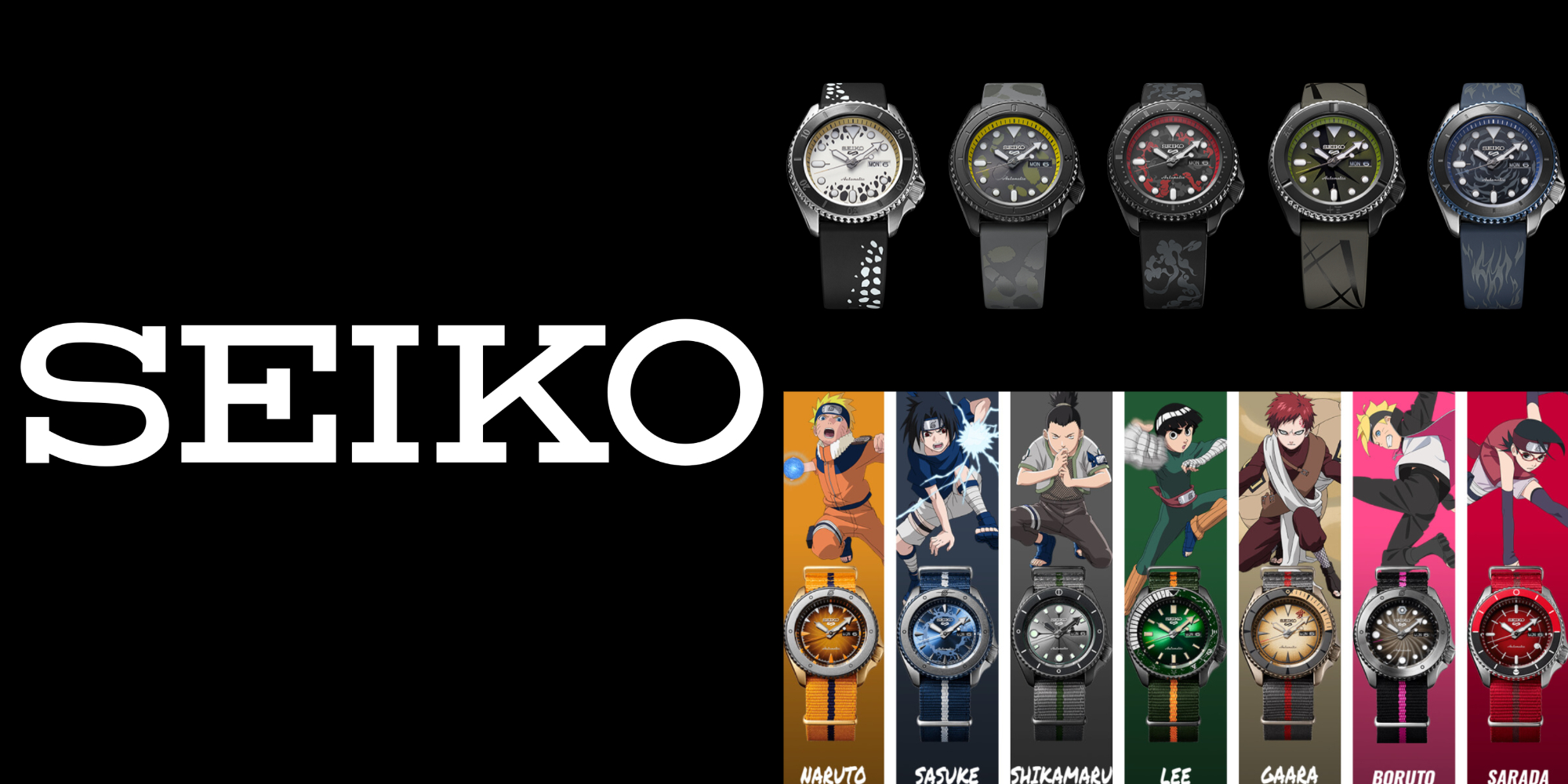 - Unfortunately, this collab has limited edition designs and was released way back in 2020. It’s quite uncertain if Seiko still produces them, but according to their website, it’s probably out of stock. Do try and check eBay or Sakura Watches for availability! However, let’s still take a peek at the list of designs for their collab. Naruto and Boruto serve as the headliners for this collection, while Sasuke, Shikamaru, Lee, Gaara, and Sarada have their designs too.