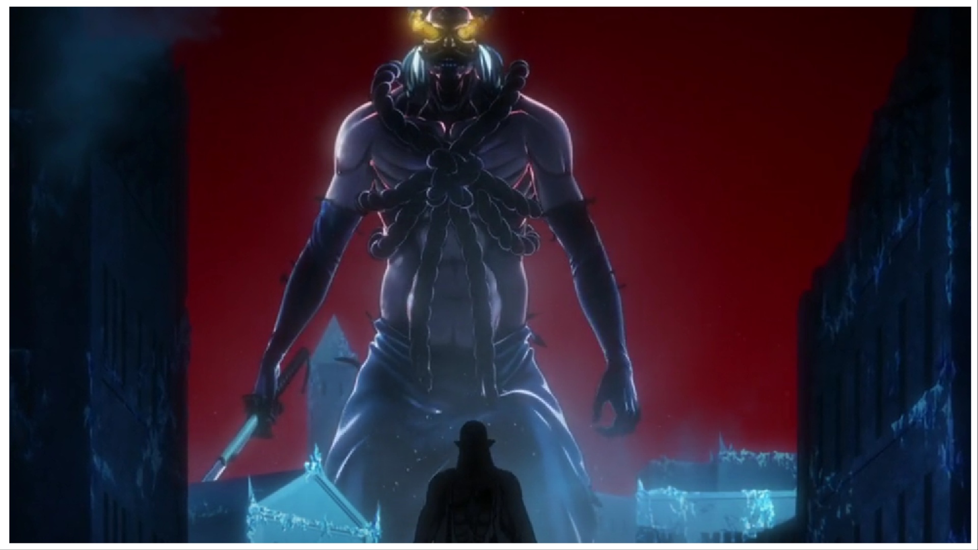 As the fight goes on, Komamura transforms into a human with immense power and we get a glimpse into his past. His dialogue with the Wolfman Clan Elder about how giving up his heart can turn him into a human with an immortal body and monstrous strength. Back to the present, we see Captain Komamura using his Bankai, Kokujō Tengen Myō’ō.