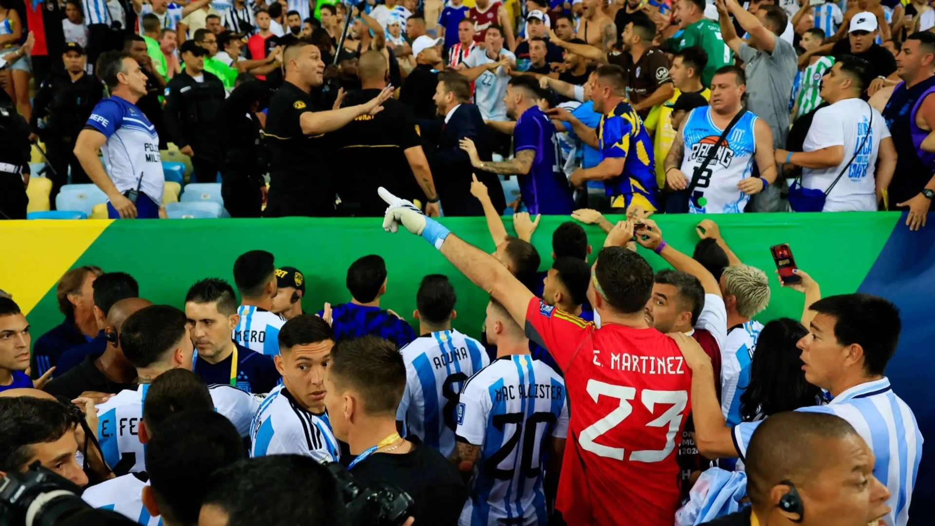 Spectators who did not even participate in the clashes were hit by objects thrown by those who were involved. One fan reportedly left the stadium with a severe head injury. Players from both teams tried to ease the situation as Argentina goalkeeper Emiliano Martinez even jumped on the rails to stop the violence.