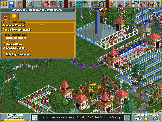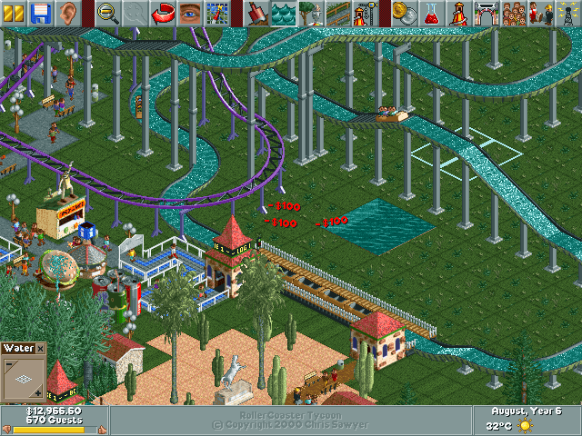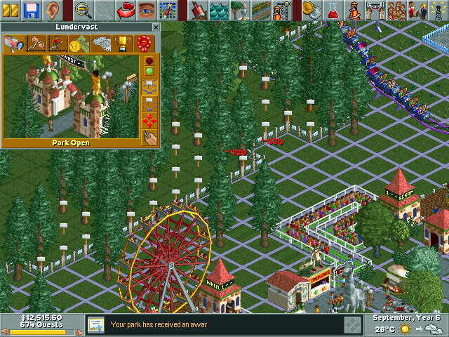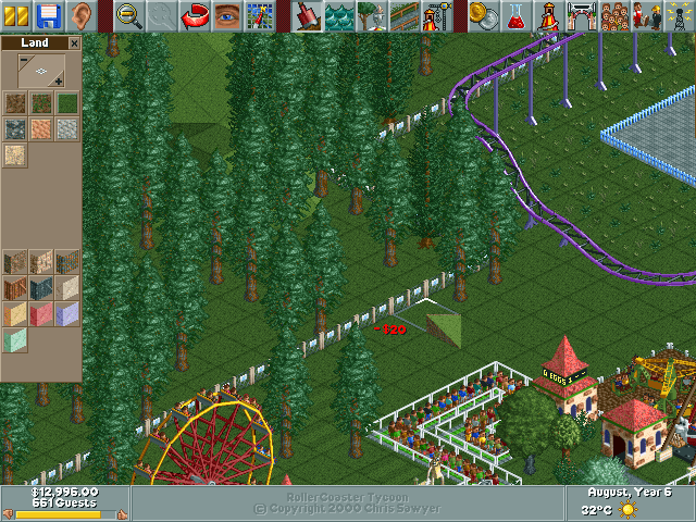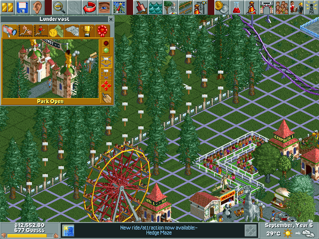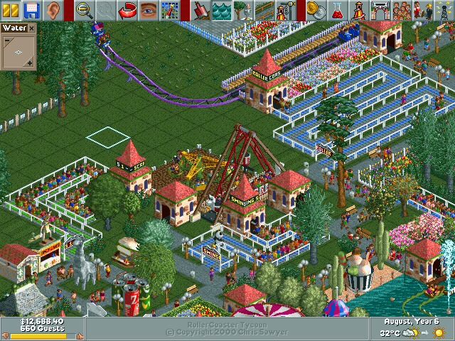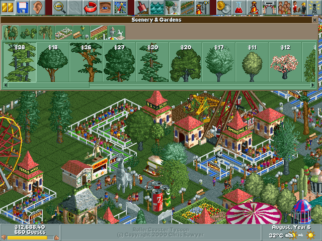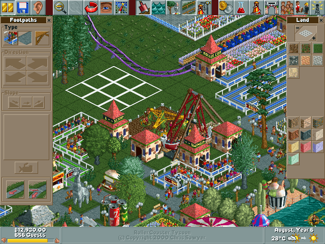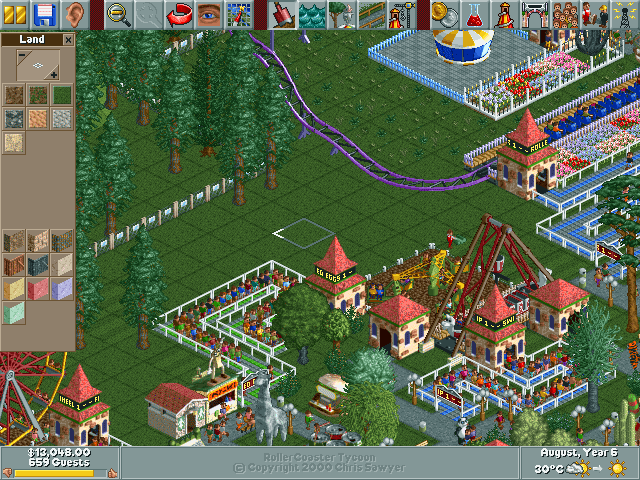 In the world of simulation games, Chris Sawyer’s RollerCoaster Tycoon is a timeless classic. It is a masterpiece which cleverly employs a range of simple techniques in its fairly traditional design to replicate a life-like image of the perfect 90s amusement park. The name RollerCoaster evokes a sense of thrill, as evidently, the odd-looking bogey locomotes on tracks that run high and then descends rapidly through cool air. In fact, the name itself denotes the core idea behind the game and what you are expected to do in it. It is here that you build your ideal theme park and the roller coaster is the ultimate symbol of entertainment.