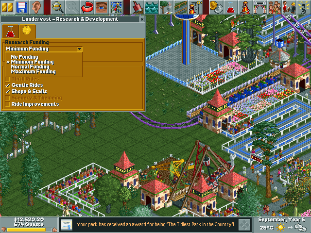 There are buildings that do not appear on the building tab from the beginning. In order to unlock them, one has to research them (ref img. 6.0). The research system is fairly simple, probably owing to the limitations of the engine. The mode of conducting research necessitates capital investment or funding. You can choose how much money you want to pour into your research (ref img. 6.1, 6.2), albeit the options are unintelligible. Even I don’t know how much money will be siphoned off your bank after you hit ‘maximum funding’. Or you can say, I was a little paranoid to try as I worked very hard to bring my amusement park to a certain stage of stability. Furthermore, there is no way of choosing what you want to research particularly. It provides you with categories. Checking one of them will lead to the selection of an attraction at random to be researched. Thus, over-simplicity has its own drawbacks. Running dry? Don’t worry, the game gives you an easy way out too, just cut the funding and the research will stop immediately.