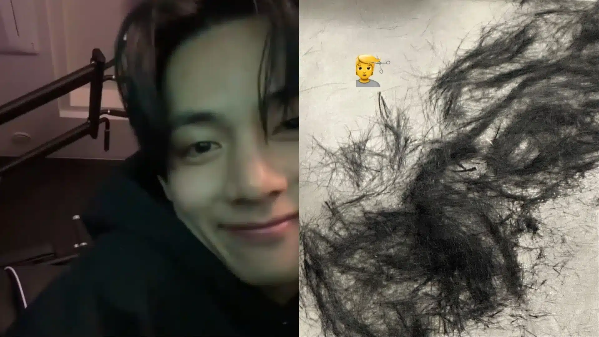 On Nov 26, V updated his IG Story with a photo showing heaps of hair cut on the floor, along with an emoticon of a haircut without any caption.