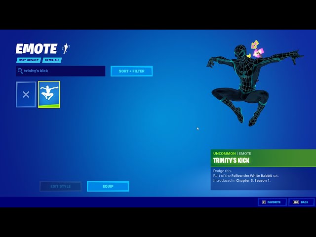 - The other emote is Trinity’s floating kick. It costs 200 V-Bucks. it will help you to hit in the heat of battle. It can be reserved for the lobby prior to the match or when celebrating a victory royale.