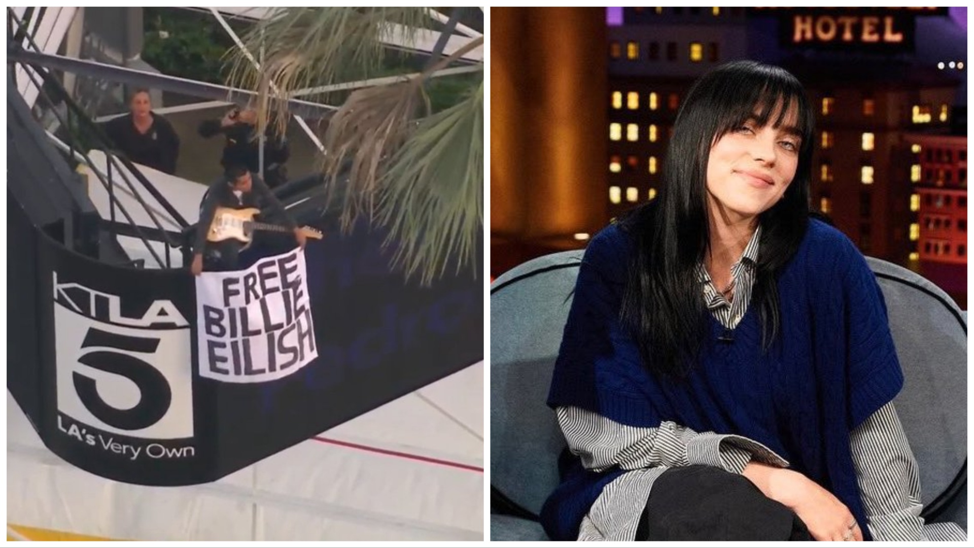 A man with an electric guitar scaled the iconic KTLA tower in Hollywood, Los Angeles. He’s refusing commands from Los Angeles Police Department to come down while holding a sign that reads "Free Billie Eilish." 📸: @ABC7 pic.twitter.com/7Elt8JHOE2