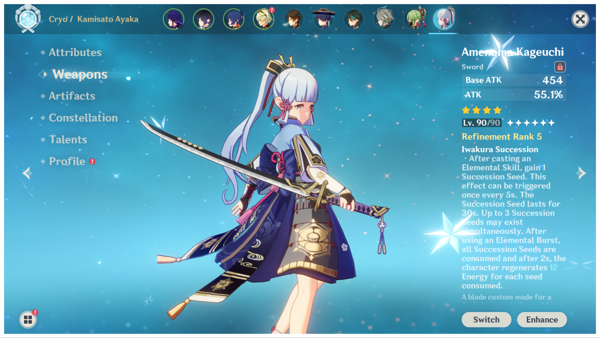 Next up on the list is the Amenoma Kageuchi, which is a craftable option in Genshin Impact. Now, the majority of Ayaka’s damage comes from her Ultimate Ability, which has a high energy cost of 80.