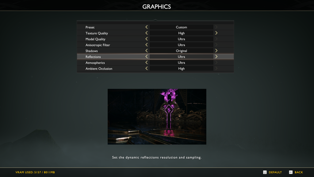 Most visual settings go from Min>Low>Original>High>Ultra(and Ultra+ for Reflections). There is text that tells you what each setting is i.e. better model quality, better texture quality. And there’s also a little image that is intended to show you how changing the settings affects the scene. But it’s not helpful. I genuinely only found that image useful when comparing the shadow quality settings and maybe a bit for the reflections settings. But otherwise, I was finding it hard to find differences there.