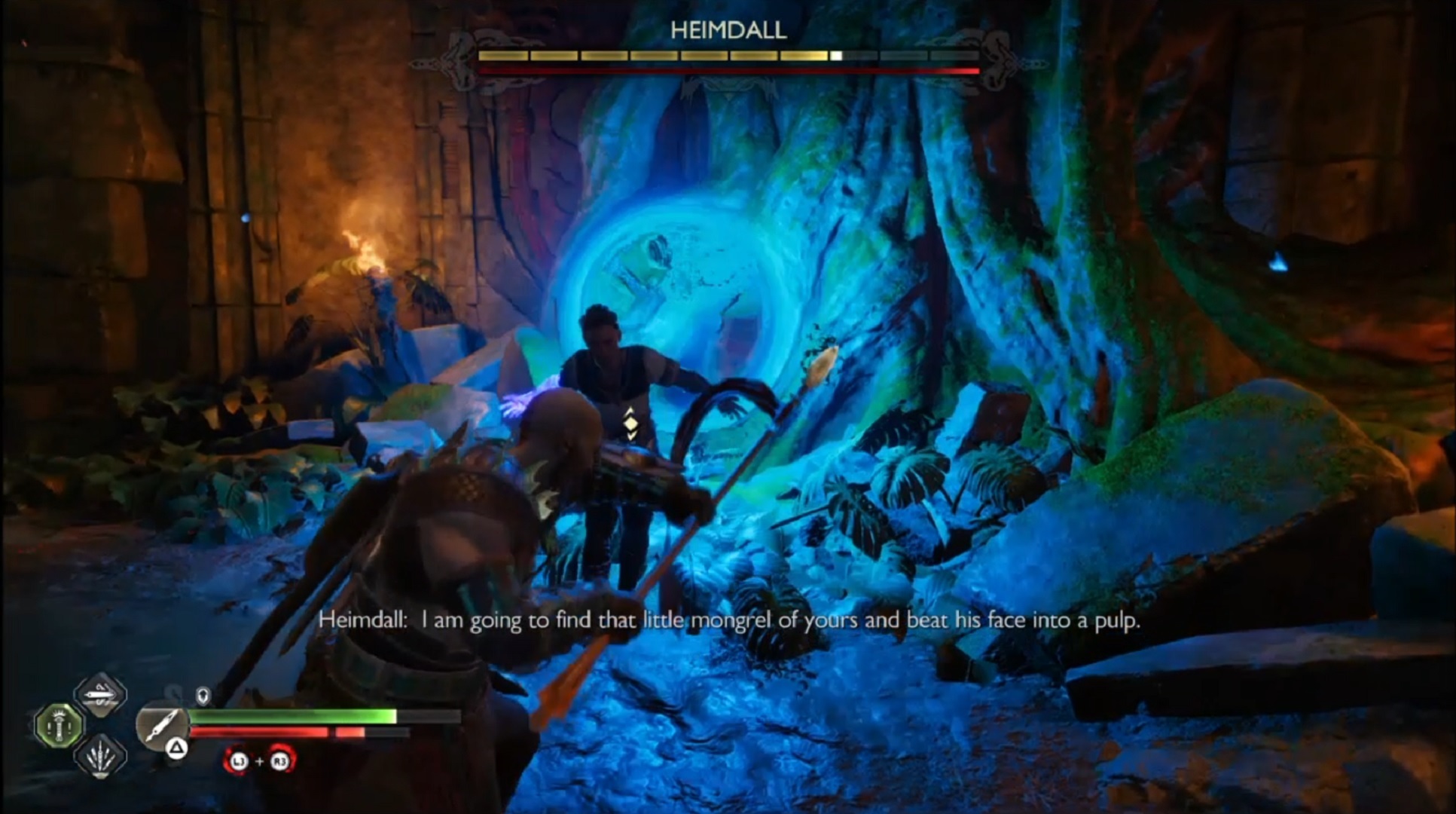 - Heimdall would do another Realm Shift, and once Kratos successfully dodges his attack, Mimir shouts “He’s open!”. You should take this opportunity to utilize the R1 combo of the Draupnir Spear to Heimdall and inflict an amount of damage.