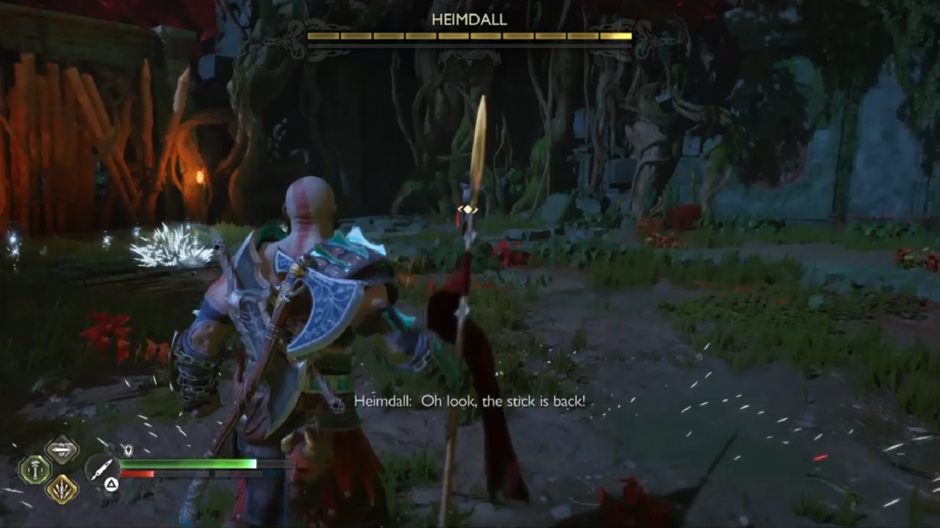 - Okay, this boss fight would require patience from you, warrior. Anyhow, take a peek at the red meter below Heimdall’s health, and when it is filled up, it would be an opening for Kratos to attack him. Take note that at this point, Heimdall remains untouchable. Do try to parry Heimdall’s attack with the yellow ring.