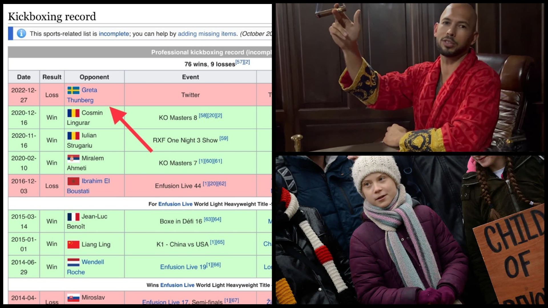 Greta Thunberg defeats Andrew Tate in Kickboxing; Wikipedia edit explained