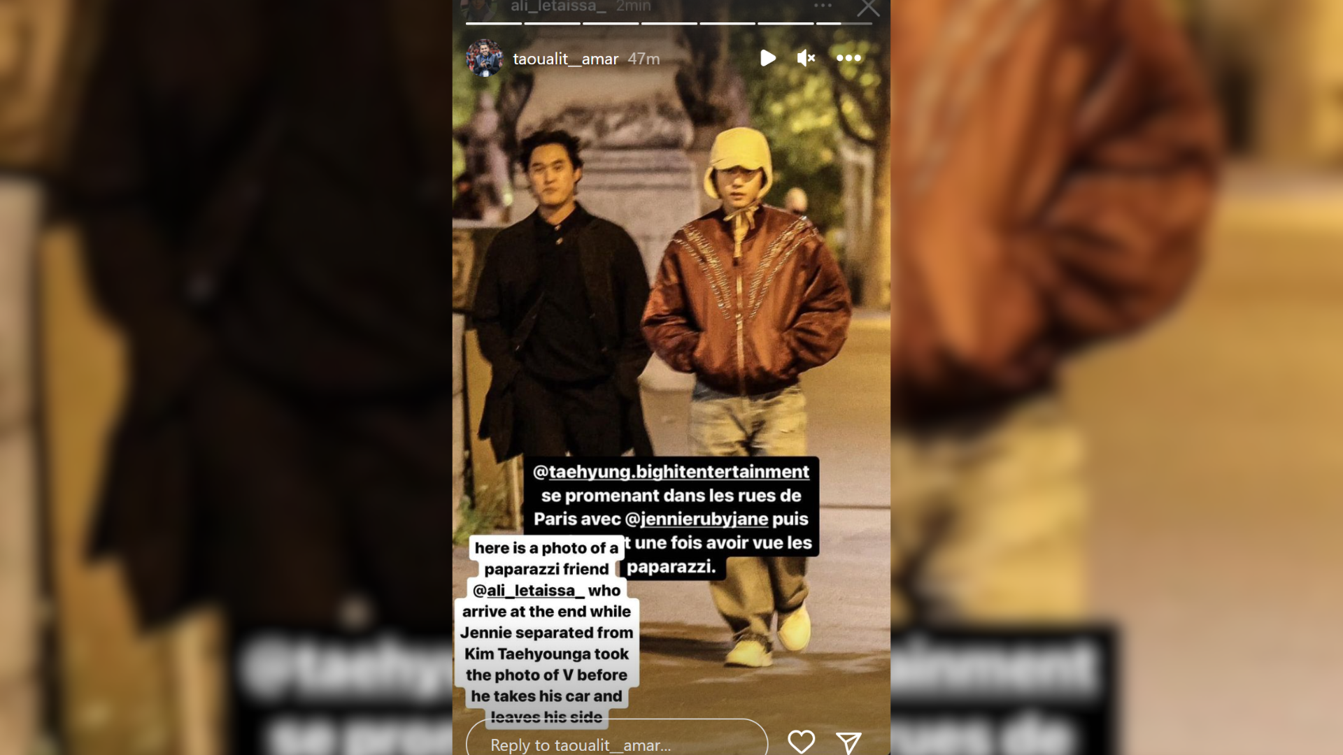 A Parisian journalist named Amar Taoualit shared the alleged photograph and video of BTS V and BLACKPINK Jennie. Per his LinkedIn profile, he has worked with the news outlet Loopsider for the past two years. Taoualit uploaded multiple images and videos of a man and woman strolling on the bank of the River Seine through his Instagram, claiming it was BTS V and BLACKPINK Jennie.