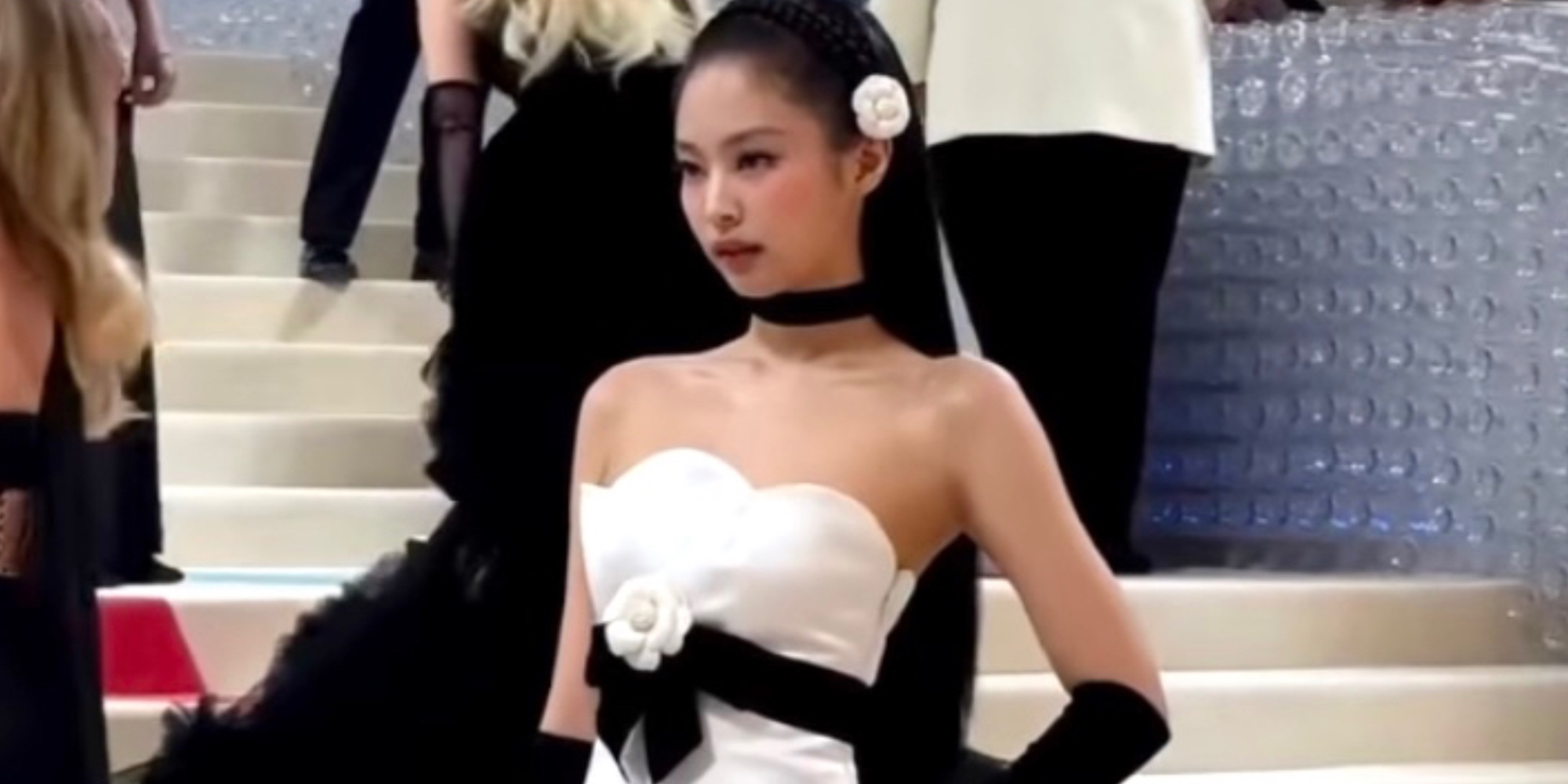 To complete the Met Gala 2023, BLACKPINK Jennie Kim accessorized with black tights and heels. It matched her opera gloves and her simple ribbon choker. Her hair is styled with a headband braid while her long hair flows on her back.