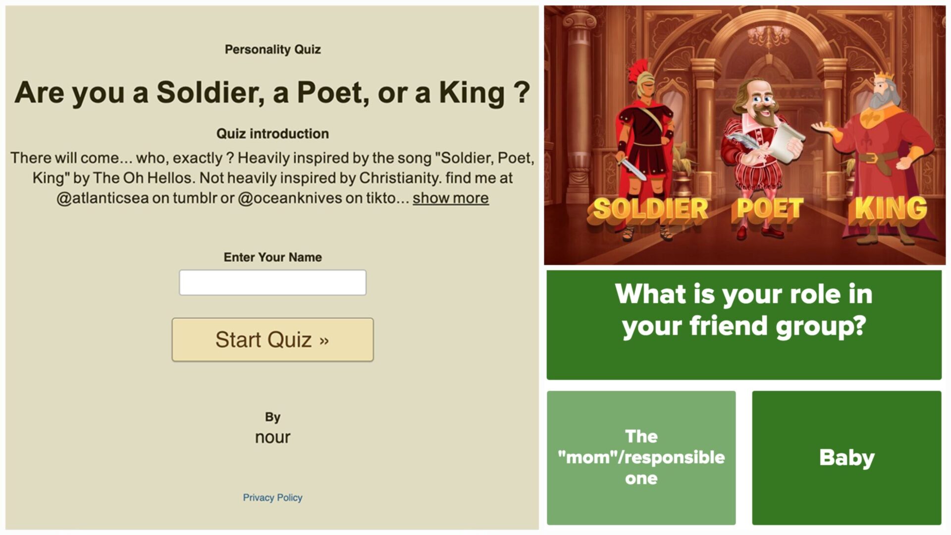 - However, on the downside, the original quiz of user Nour only offers three options. Once you achieve all three Soldier, Poet, and King there isn’t much left to do.