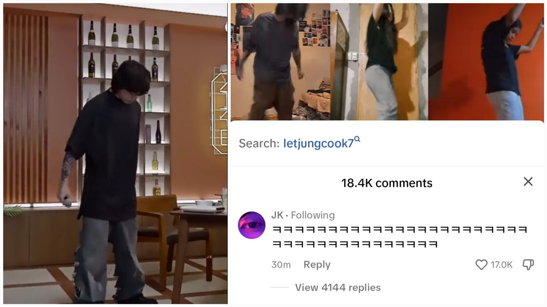 - Some even recreated the outfit of BTS Jungkook- a classic oversized black T-shirt with baggy jeans and the wooden background of Suchwita’s set. Others appeared in progressively hilarious and creative sets of outfits and backgrounds.