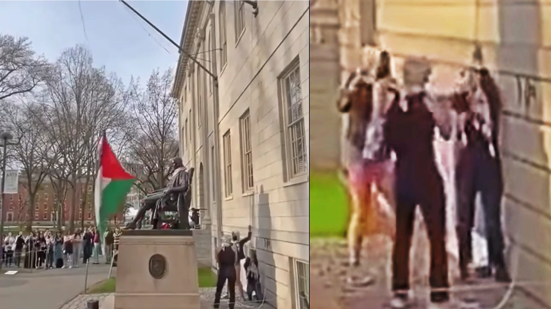 Three masked individuals raised the Palestinian flag on a statue with witnesses cheering them on. According to some videos circulating online, these individuals are Harvard University students.