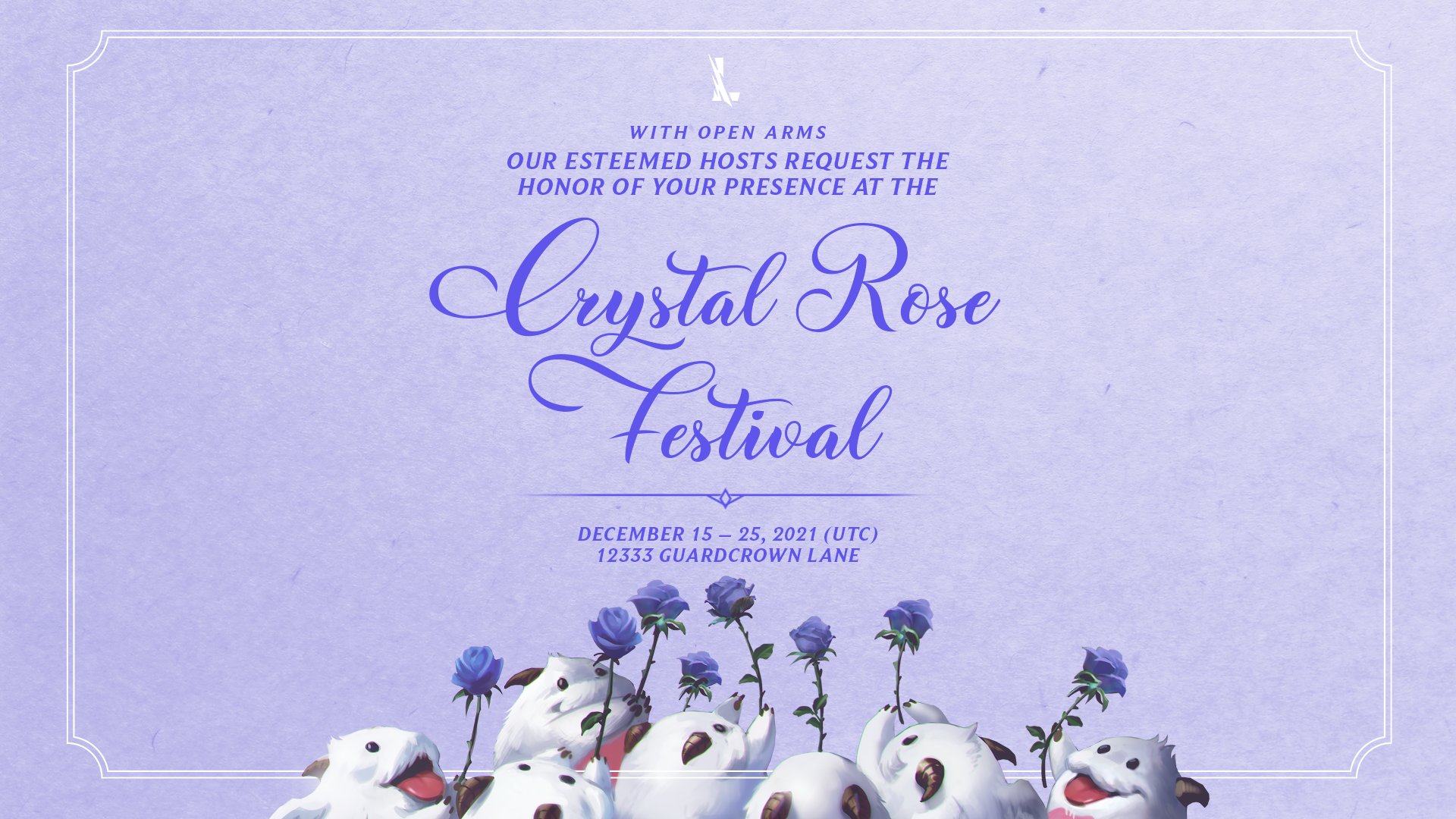 It is our greatest joy to announce that the Crystal Rose Festival will begin on Tuesday, December 14th at 4:01pm PT in Wild Rift! 💌 May we expect the pleasure of your company? 💜 pic.twitter.com/1zF2v0iILs